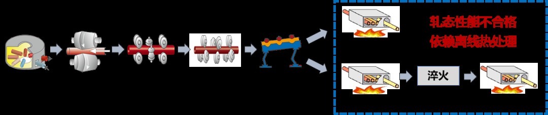 这导致热轧无缝钢管长期以来缺乏有效的在线组织性能调控手段,热轧态产品强度低、韧性差,合格率低(以最为基础的Q235钢为例,30mm以上壁厚产品轧态性能合格率不足60%),产品性能提升只能依靠添加更多的合金元素及后续离线热处理(如图1所示),管材产品同比合金元素、吨钢能耗明显高于其他钢材门类,生产成本高、能源消耗量大、生产周期长,特别是在进一步提高强度、韧性以及焊接性能方面极为受限,成为制约热轧无缝钢管产品性能全面提升的瓶颈。