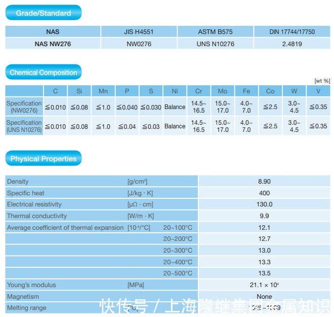 | 热处理 | NAS NW276的固溶退火通常在1150-1170℃的温度范围内进行,然后在水中淬火或通过其他方式快速冷却。 |