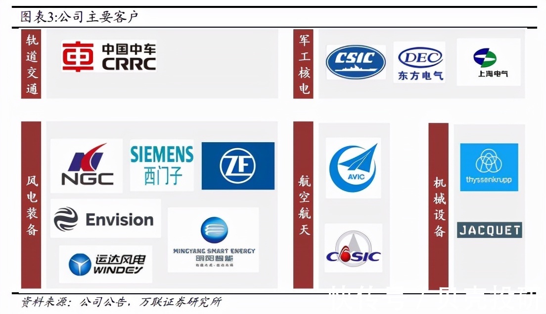 据万联证券研报分析,通过高度聚焦下游重点应用领域,包括新能源风电、轨道交通、机械装备、军工装备、航空航天、核能电力、海洋石化等,公司形成了差异化竞争模式,在各细分领域均取得了较强的竞争优势。