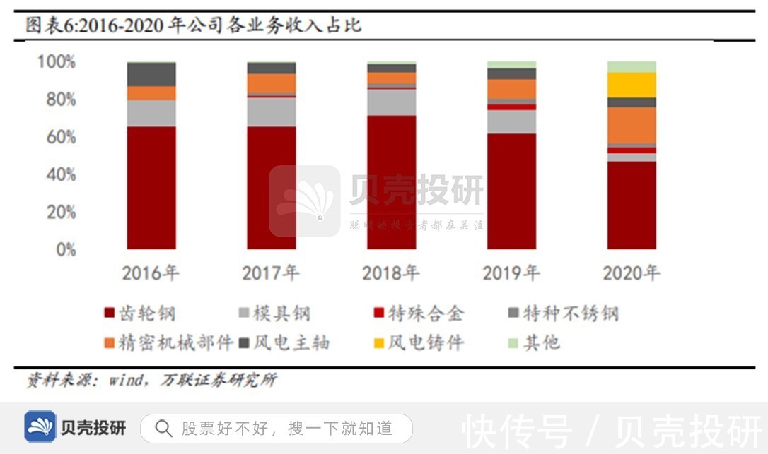 特钢材料和零部件双轮驱动,零部件板块突飞猛进。公司从2019年开始的业务调整是近两年公司业绩高增的主要原因,从19年开始,公司业务中心逐步从上游钢材熔炼向下游各产业零部件延伸。2020年,公司零部件收入占比接近50%,预计今年将超过特钢材料成为公司第一大收入来源。从零部件细分领域来看,公司90%以上零部件收入来源于新能源风电行业,包括风电铸件、主轴以及部分齿轮箱零部件等。